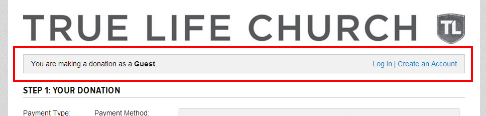 Donors have the ability to create accounts to store information, view donation history, and modify or fix recurring donations. This is a built-in feature of GivingFire and can't be turned off, although using accounts is completely optional for the donor. Donor accounts can be accessed through the donation page, via a navigation bar at the top of the screen: