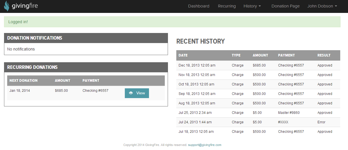 Once a user logs in, they'll see a customized dashboard for their account. This is different from the administrative dashboard - they'll only have access to their donations to your organization.
